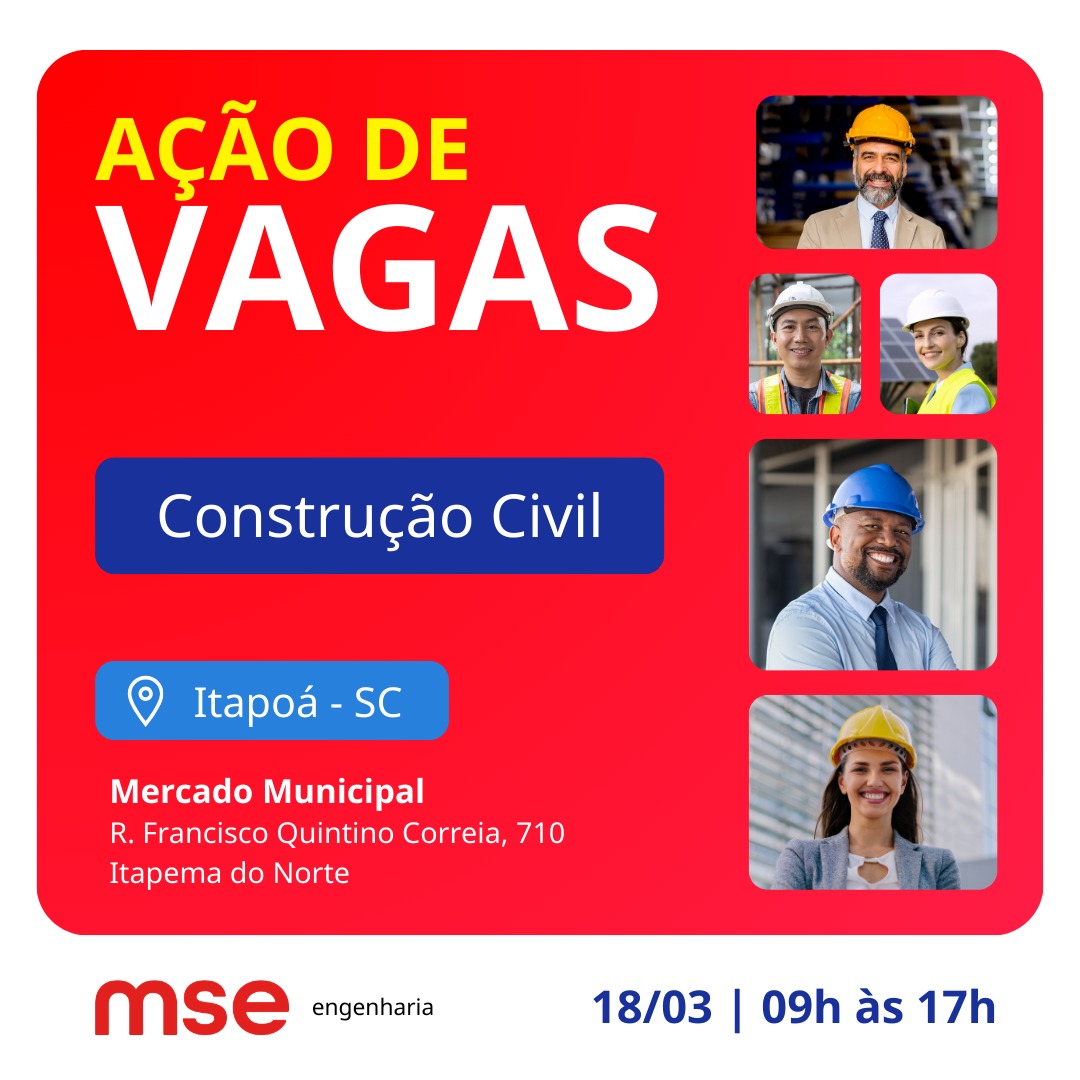 A MSE Engenharia realizará uma Ação de Vagas voltada para profissionais da construção civil no Dia 18/03 em Itapoá (SC)